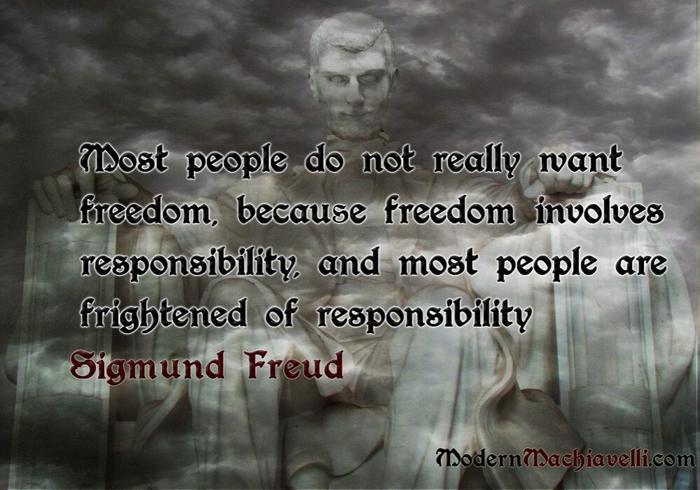 Quote by Sigmund Freud about Freedom & Responsibility Most people do not want freedom because freedom involves responsibility, and most people are frightened of responsibility. - Sigmund Freud